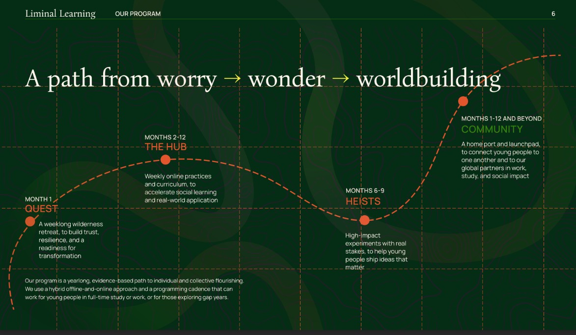 I'm a founding member of Liminal Learning, a year-long program designed for 18-25 year olds navigating the transition into purposeful adulthood. We have 5 scholarship places available for our next cohort which starts on October 19th.